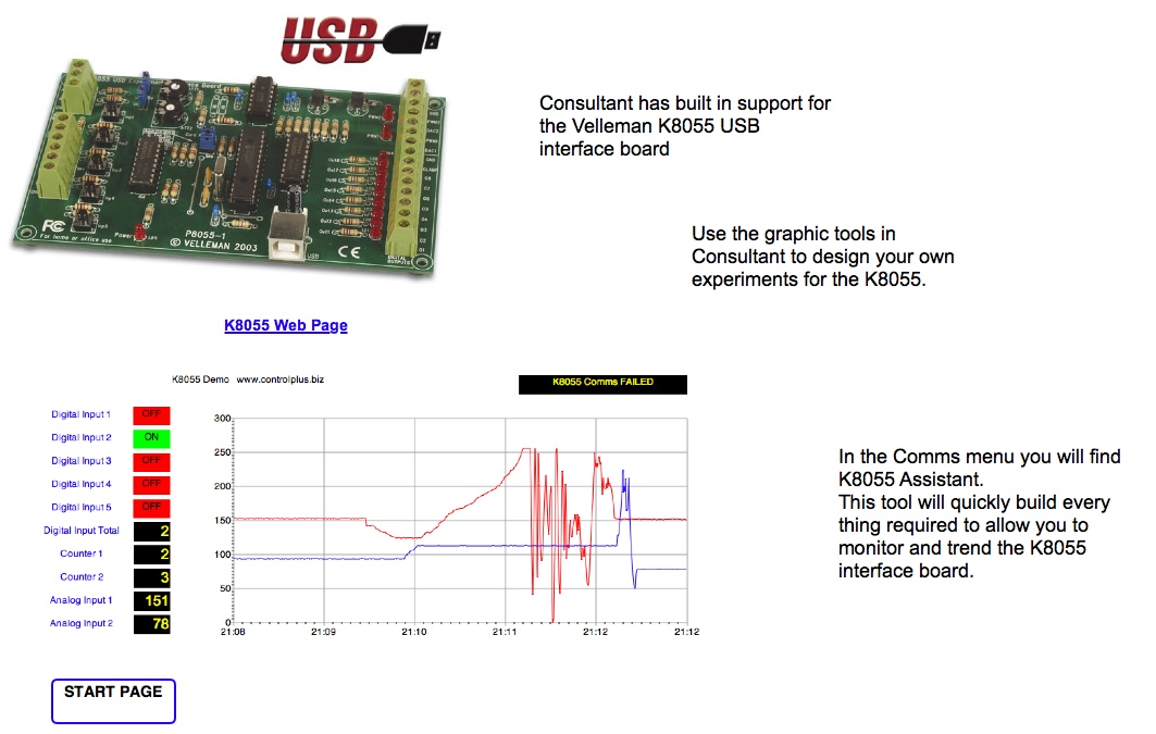 The K8055 from Velleman is a small USB experimenters board. Consultant has built in support for this board so you can quickly interface to the real world with a very cost effective solution.