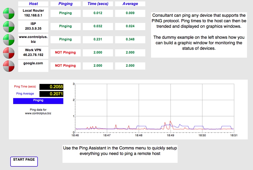 Consultant can display and trend the ping time to any host on the network. You could for example set up a monitoring window to display the status of all your servers, routers and switches. Trends will display the ping times against time so you can see which parts of your network are failing, and when.